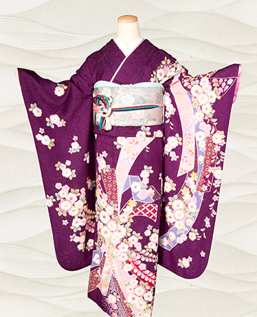 着物・袋帯・長襦袢・帯揚げ・帯締め・着付小物(腰紐4本、伊達締め2本、帯板2枚、帯枕、コーリンベルト、襟芯)・肌襦袢・裾除け(スリップタイプ)・足袋、以上が付属となります。